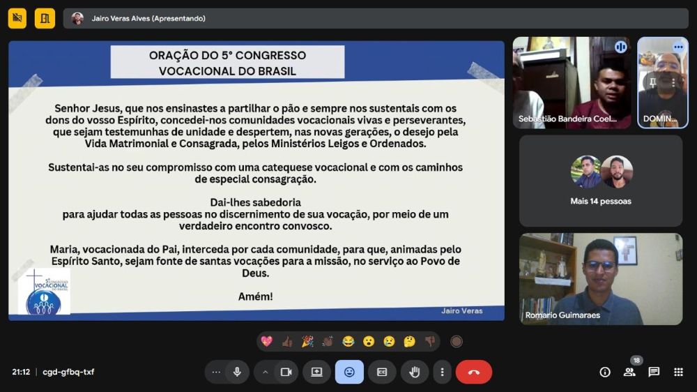 A Equipe Executiva do Serviço de Animação Vocacional (SAV) do Regional Nordeste 5 (NE-5) da Conferência Nacional dos Bispos do Brasil (CNBB), que abrange o estado do Maranhão, realizou mais um encontro virtual estratégico na noite do dia 6 de novembro. A reunião, conduzida via Google Meet, reuniu uma diversidade de agentes de pastoral, incluindo […]