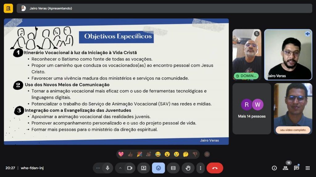 A Equipe Executiva do Serviço de Animação Vocacional (SAV) do Regional Nordeste 5 (NE-5) da Conferência Nacional dos Bispos do Brasil (CNBB), que abrange o estado do Maranhão, realizou mais um encontro virtual estratégico na noite do dia 6 de novembro. A reunião, conduzida via Google Meet, reuniu uma diversidade de agentes de pastoral, incluindo bispos, sacerdotes, seminaristas, leigos, leigas, coordenadores e animadores vocacionais das dioceses maranhenses, além de representantes de Congregações e Institutos de Vida Religiosa.